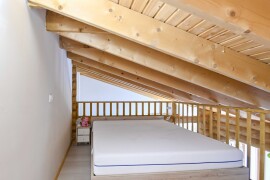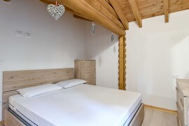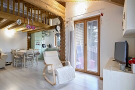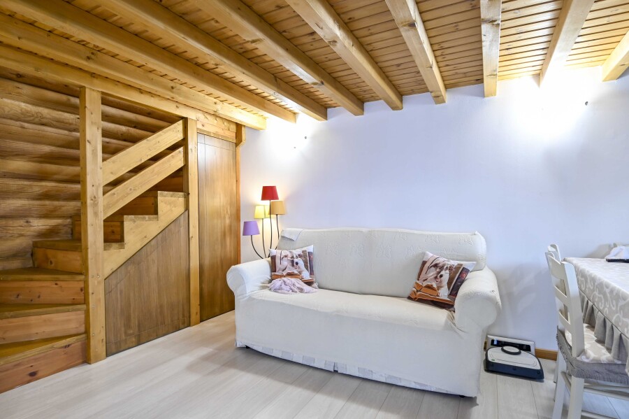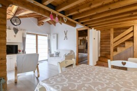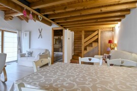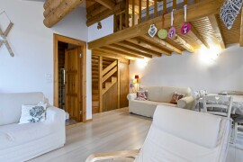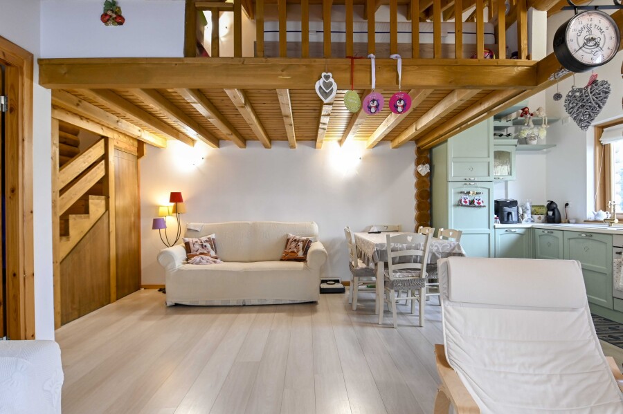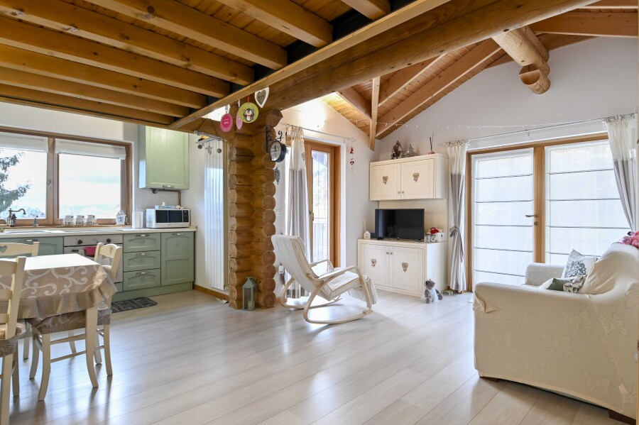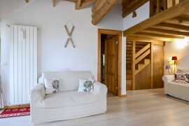 Internamente l'appartamento sprigiona tutta la sua bellezza. Ci sono delle incredibili finiture in stile montano (come le travi a vista e il legno che compone la struttura) abbinate a un arredo fresco, moderno e accogliente. L'abitazione è dotata anche di due balconi e di un bellissimo soppalco che si può utilizzare come seconda camera.