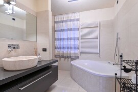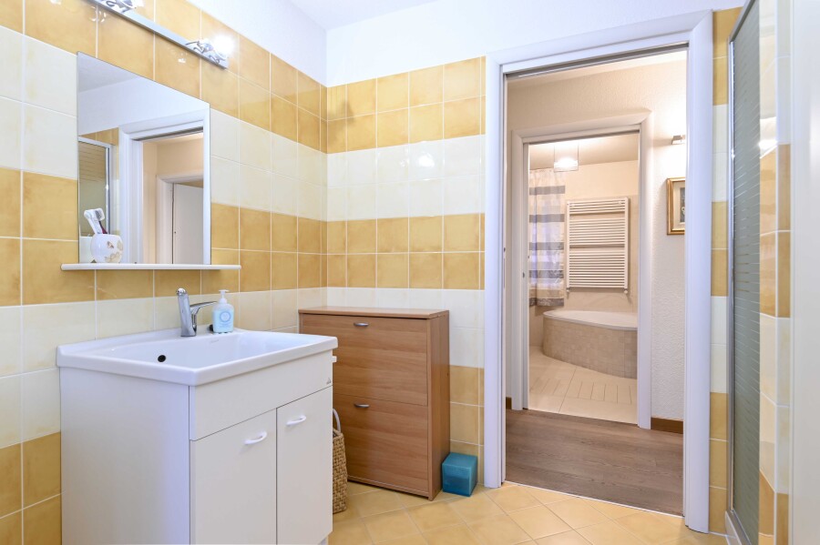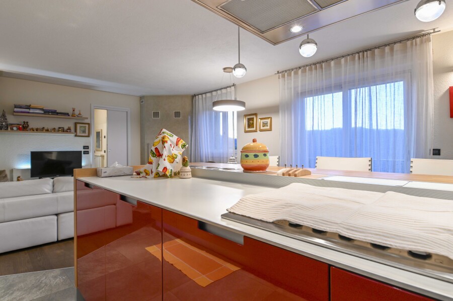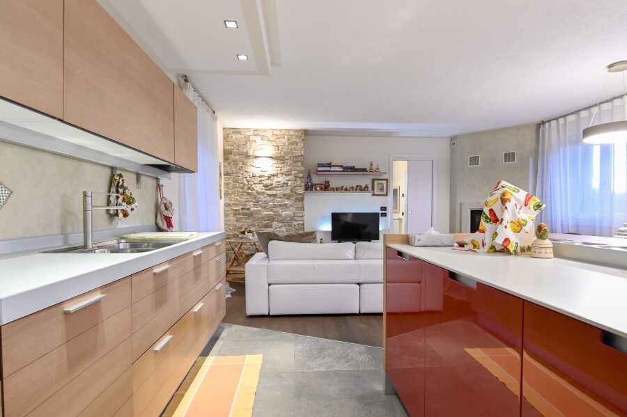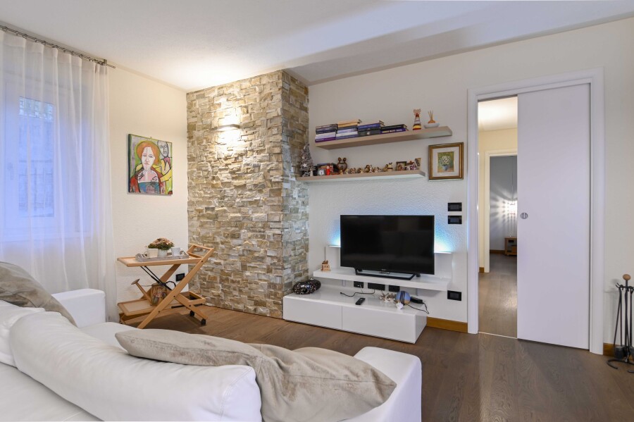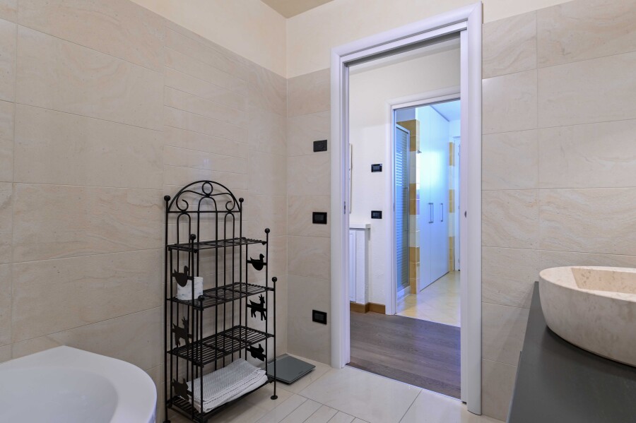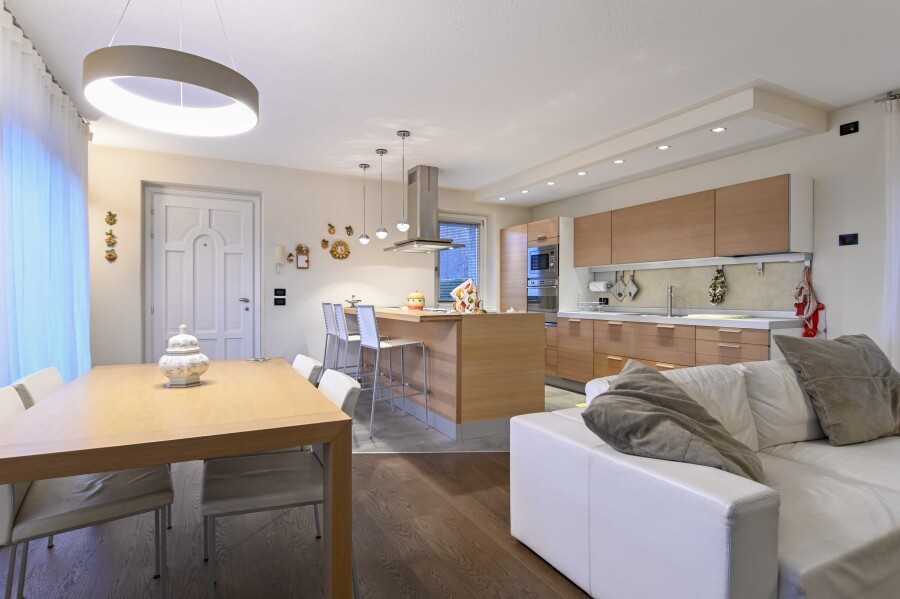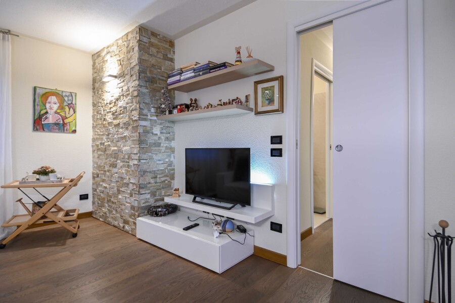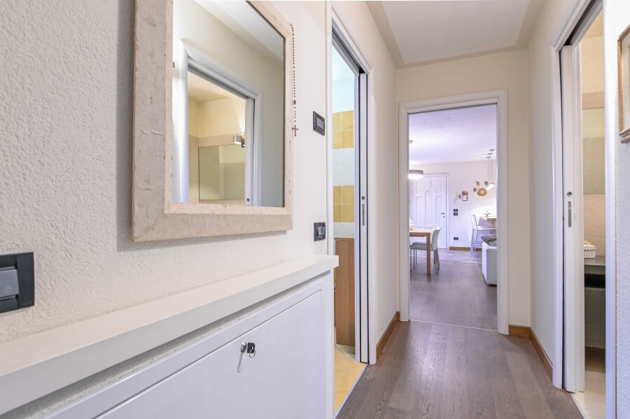 L’abitazione, pari al nuovo, offre un ampio soggiorno con cucina a vista e accesso diretto all’esterno. Un disimpegno conduce alla camera matrimoniale, alla cameretta, a un bagno finestrato e ad una grande e comoda lavanderia. Gli ambienti risultano armoniosi e ben distribuiti, con un’atmosfera immediatamente accogliente.